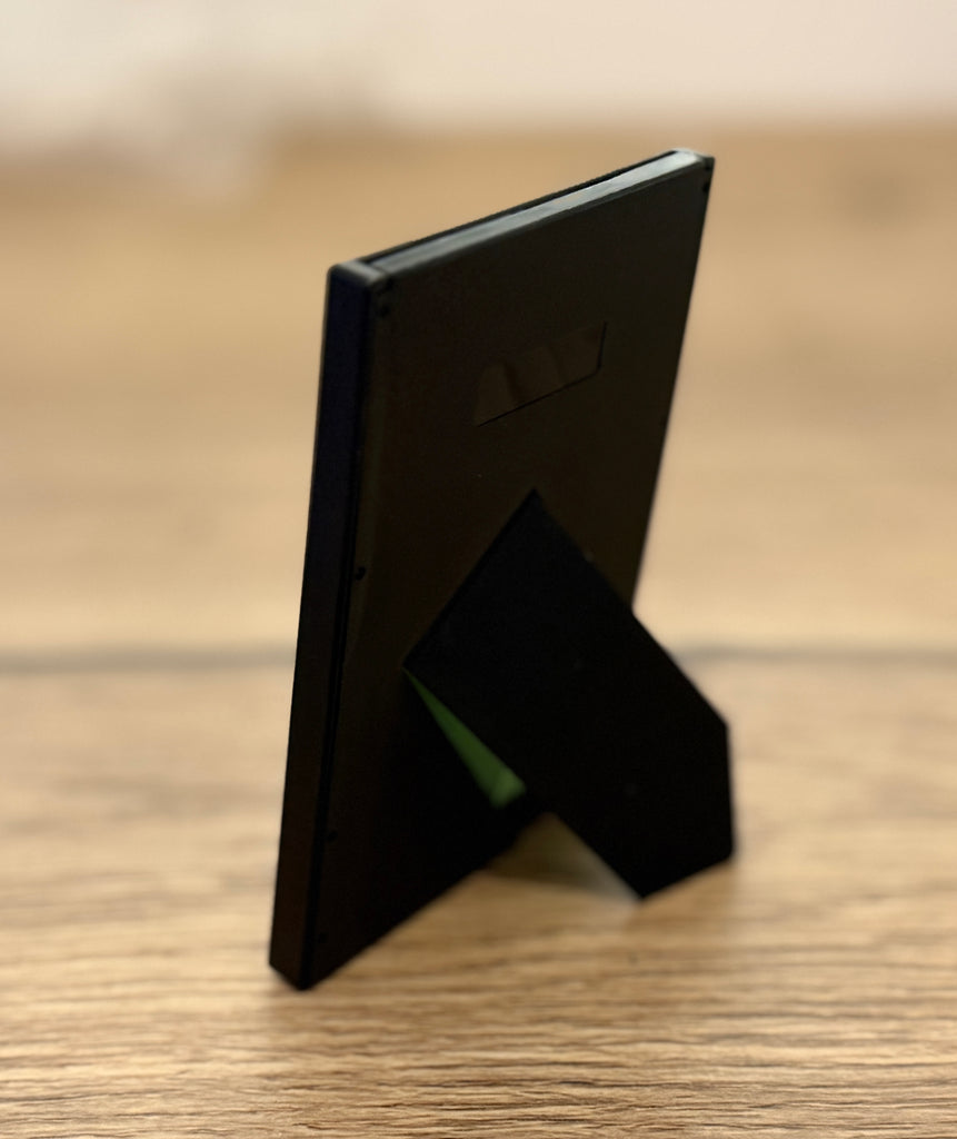 Each piece comes in a black plastic frame (6 cm wide x 9 cm high) and is hand-signed by John B.